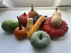 The elongated Yellow Marrow and pear-shaped Butternut add variety to an arrangement. The round, compact Sweet Mama, Uchiki Kuri, and small Halloween pumpkins add colour contrasts, either grouped or on their own.